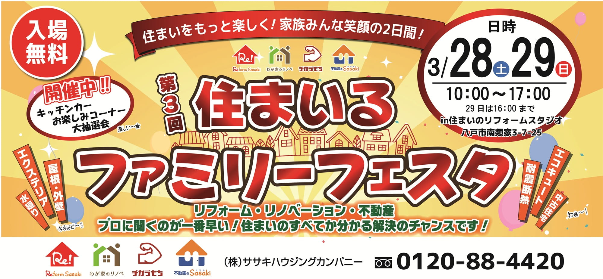 チラシはクリックで拡大します↓ 【3月28、29日限定】 【住まいをもっと楽しく!家族みんな笑顔の2日間!】 第3回住まいるファミリーフェスタ in リフォームササキ八戸東店 リフォーム・リノベーション・不動産 プロ …