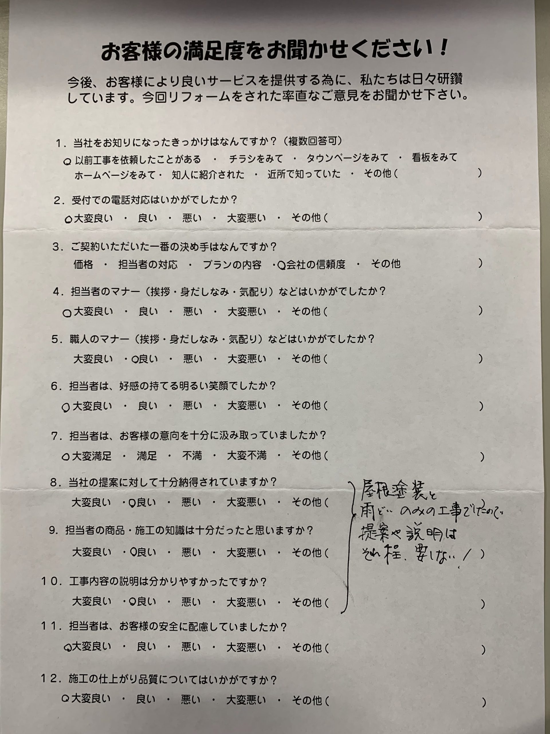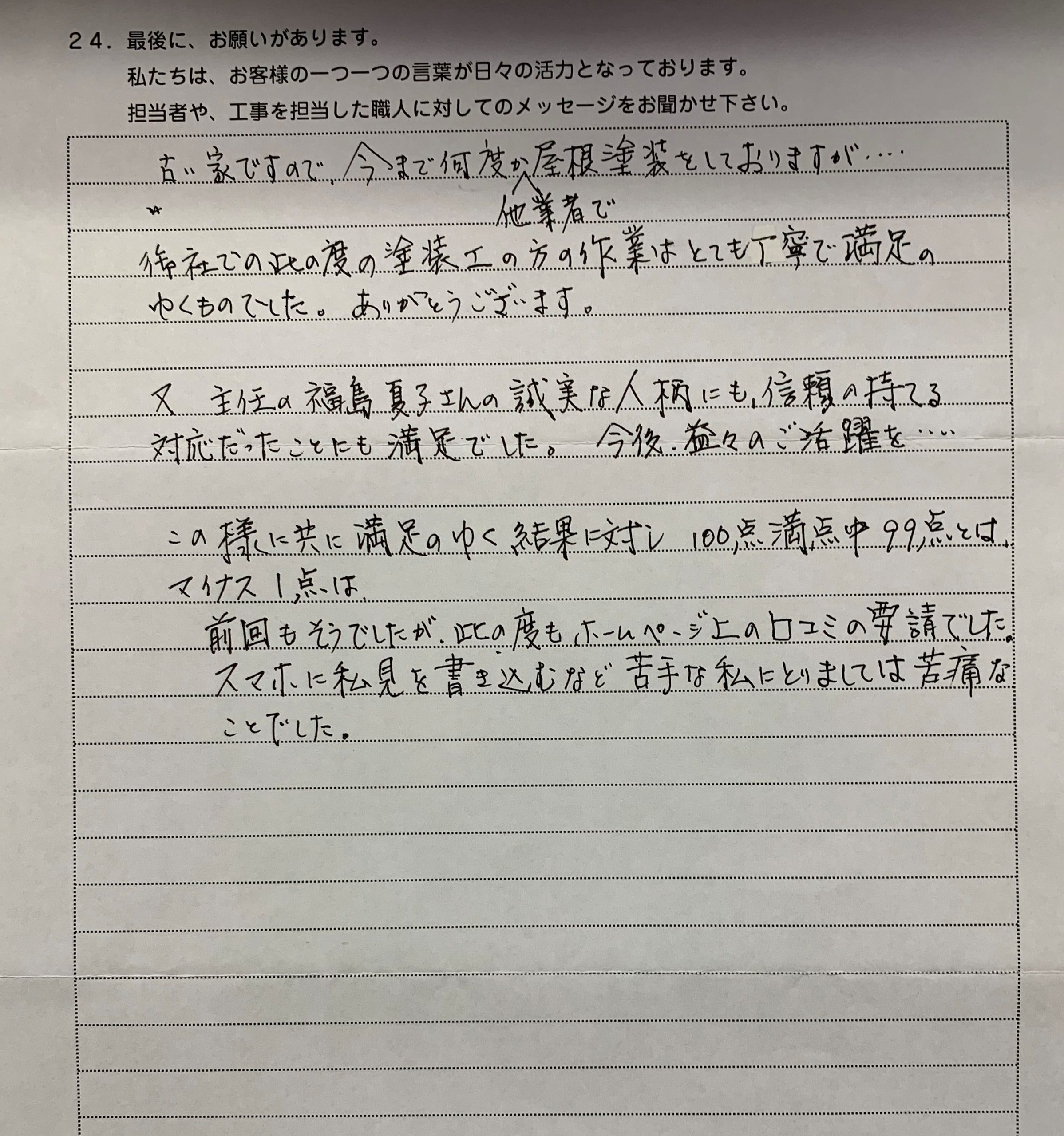 御社での此の度の塗装工の方の作業はとても丁寧で満足のゆくものでした。ありがとうございます。