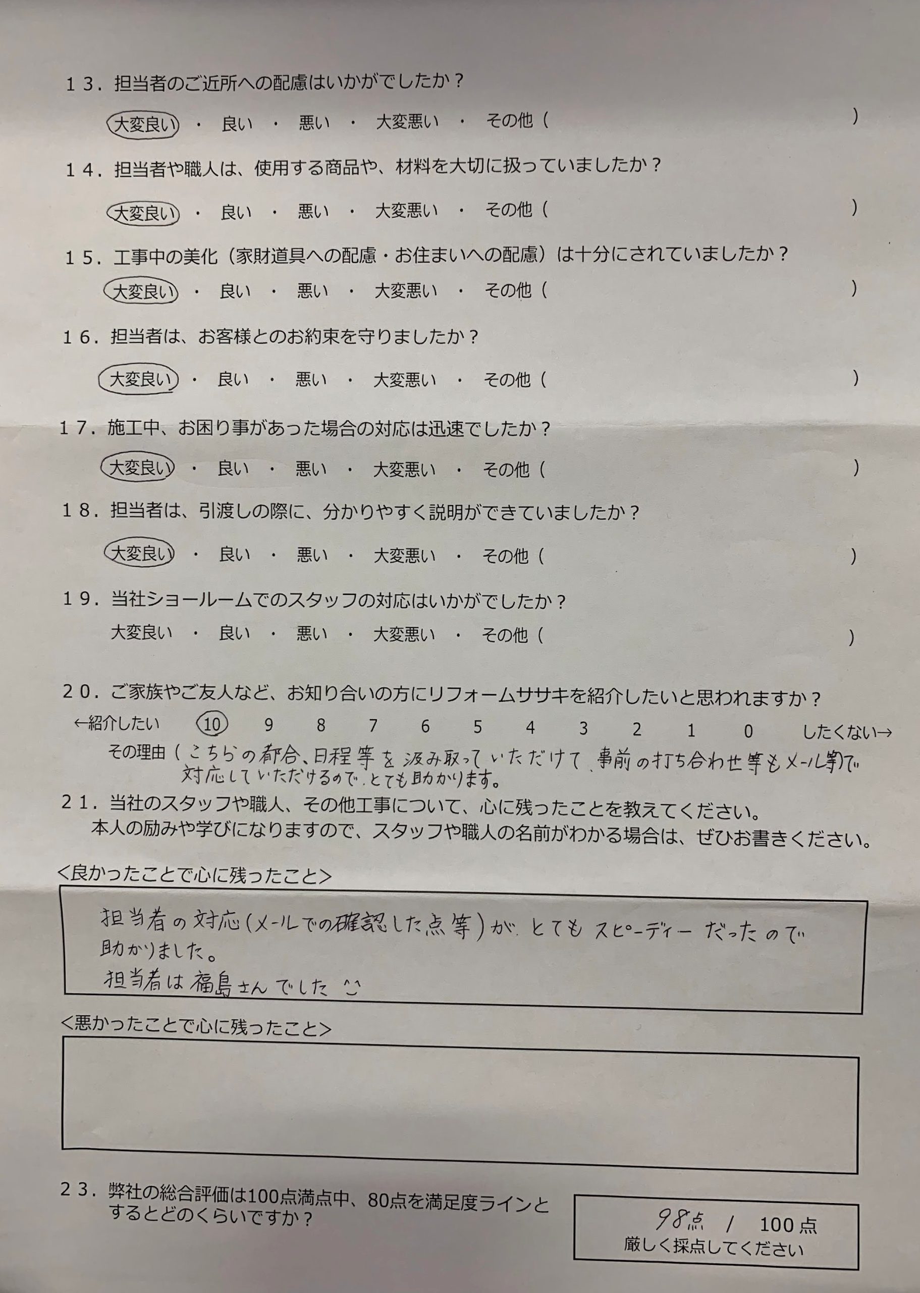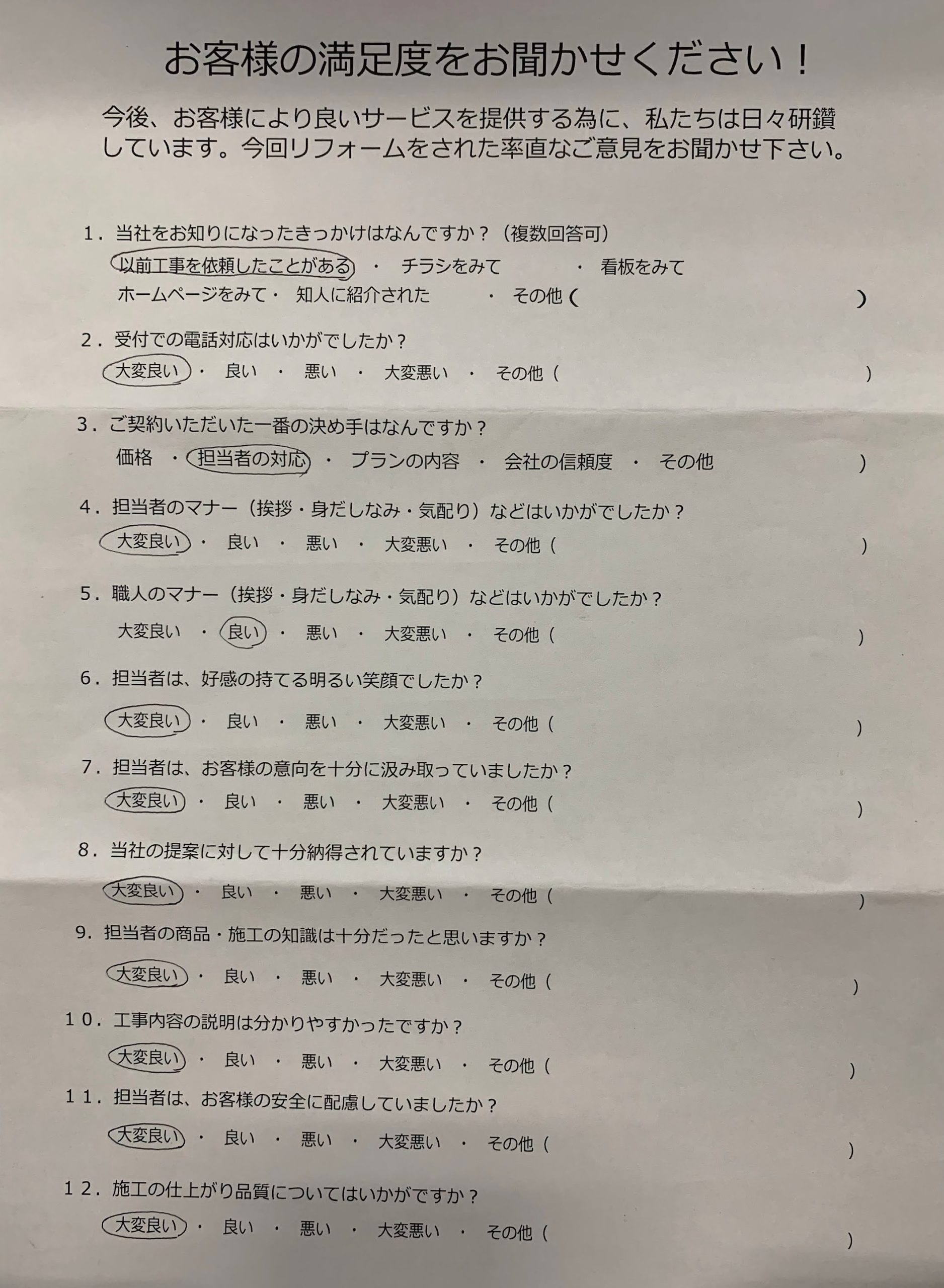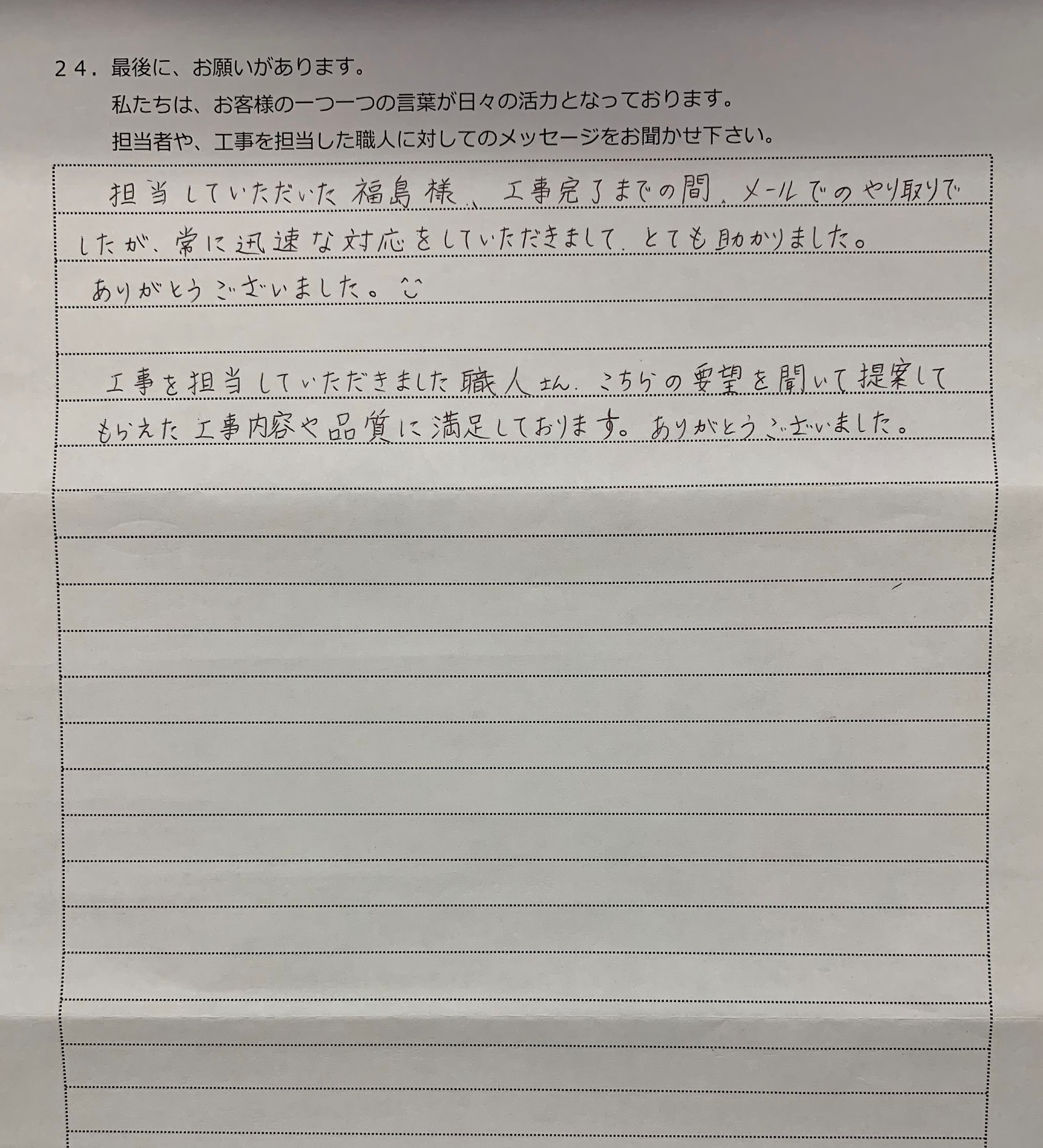 担当していただいた福島様 工事完了までの間 メールでのやり取りでしたが、常に迅速な対応をしていただきまして、とても助かりました。 ありがとうごさいました。 工事を担当していただきました職人さん、こちらの要望を聞いて提案してもらえた工事内容や品質に満足しております。 ありがとうございました。