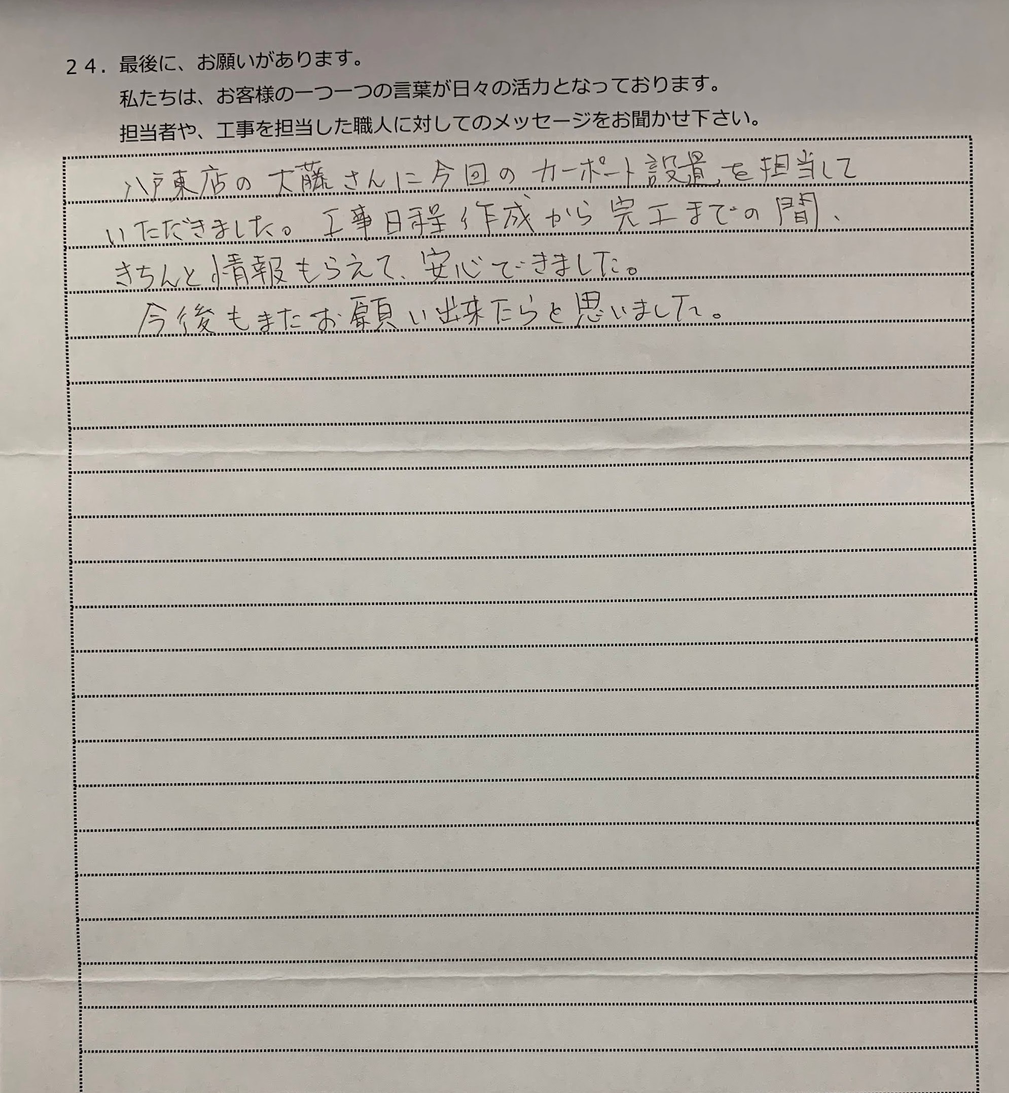 八戸東店の大藤さんに今回のカーポート設置を担当していただきました。 工事日程作成から完工までの間きちんと情報をもらえて、安心できました。 今後もまたお願い出来たらと思いました。