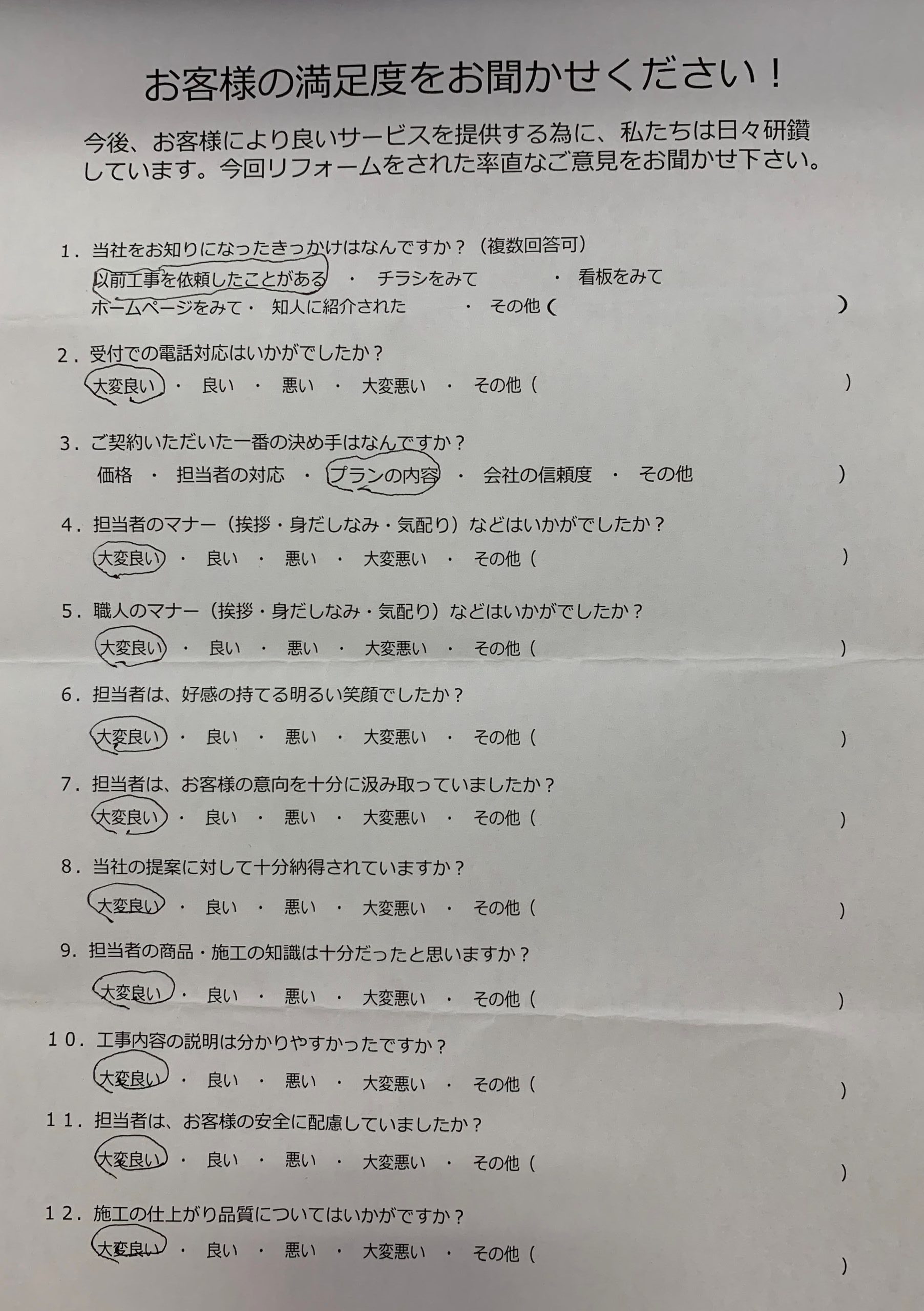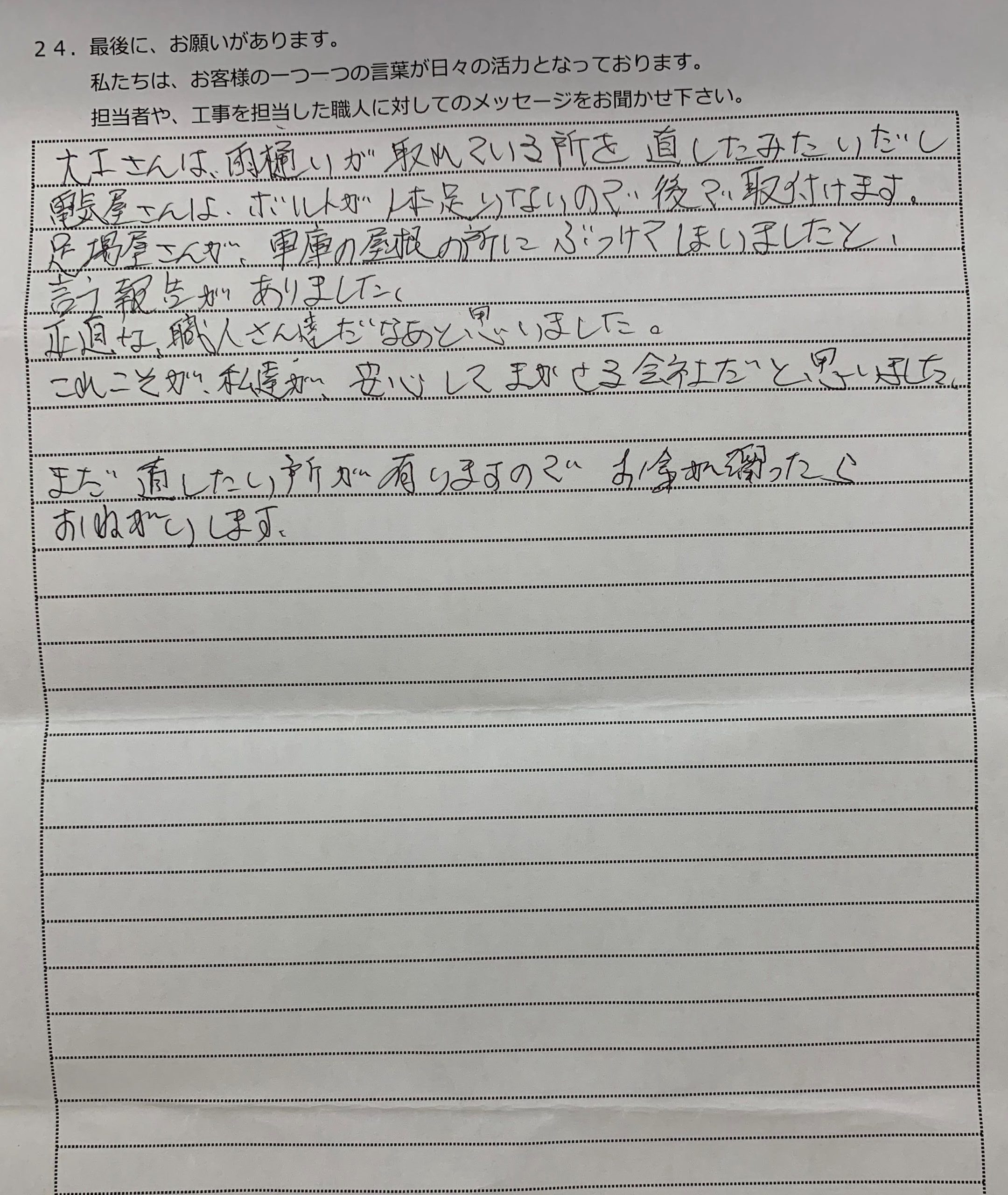 大工さんは雨樋いが取れている所を直したみたいだし、電気屋さんはボルトが1本足りないので後で取付けます。 足場屋さんが、車庫の屋根の所にぶつけてしまいました。と言う報告がありました。 正直な、職人さん達だなあと思いました。 これこそが、私達が安心してまかせる会社だと思いました。 まだ直したい所が有りますのでお金が溜まったらおねがいします。
