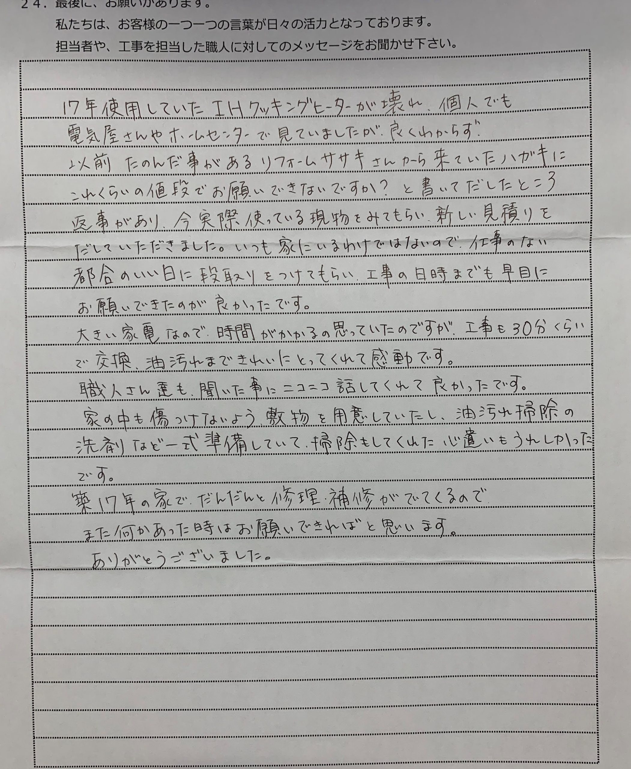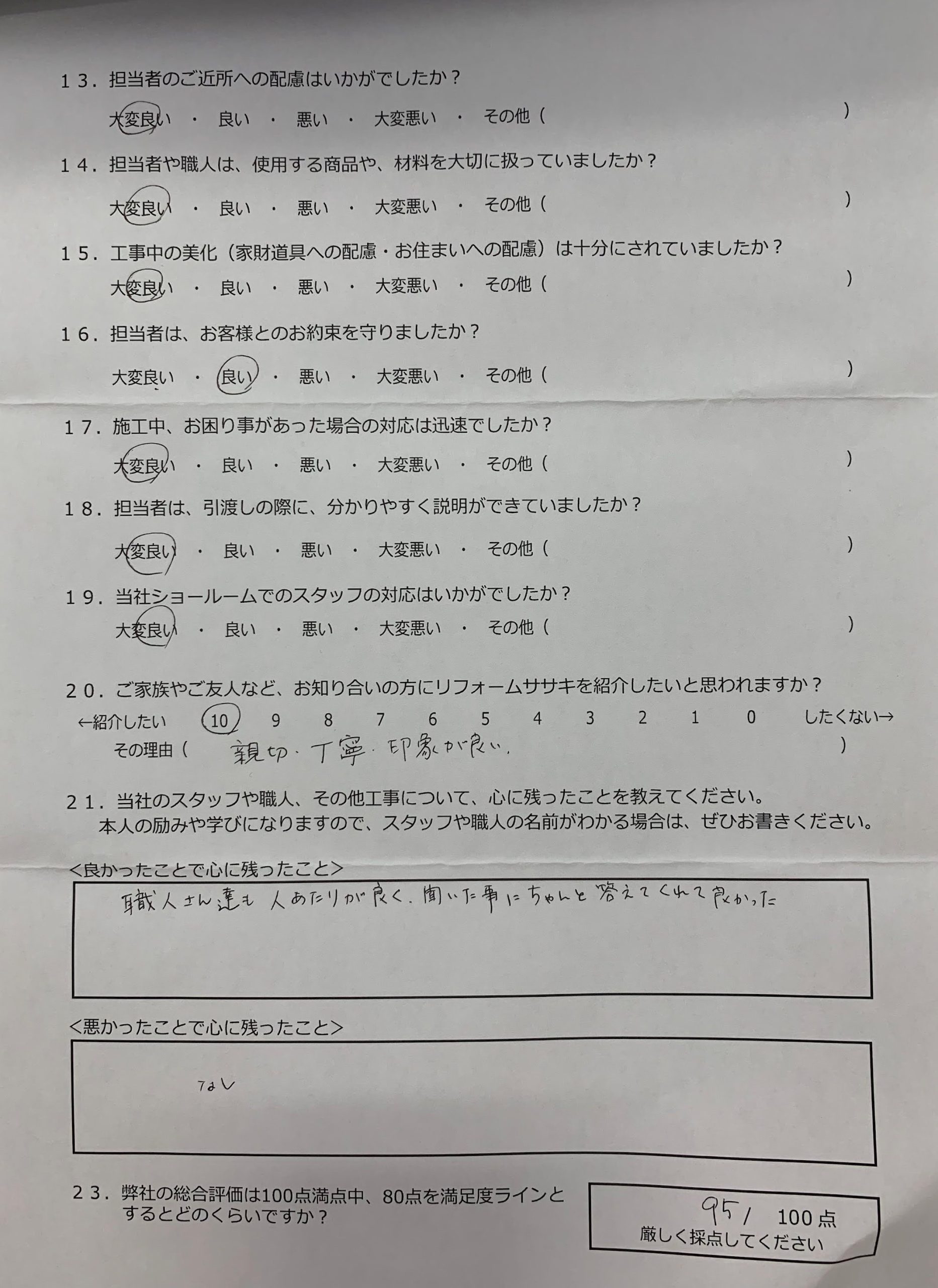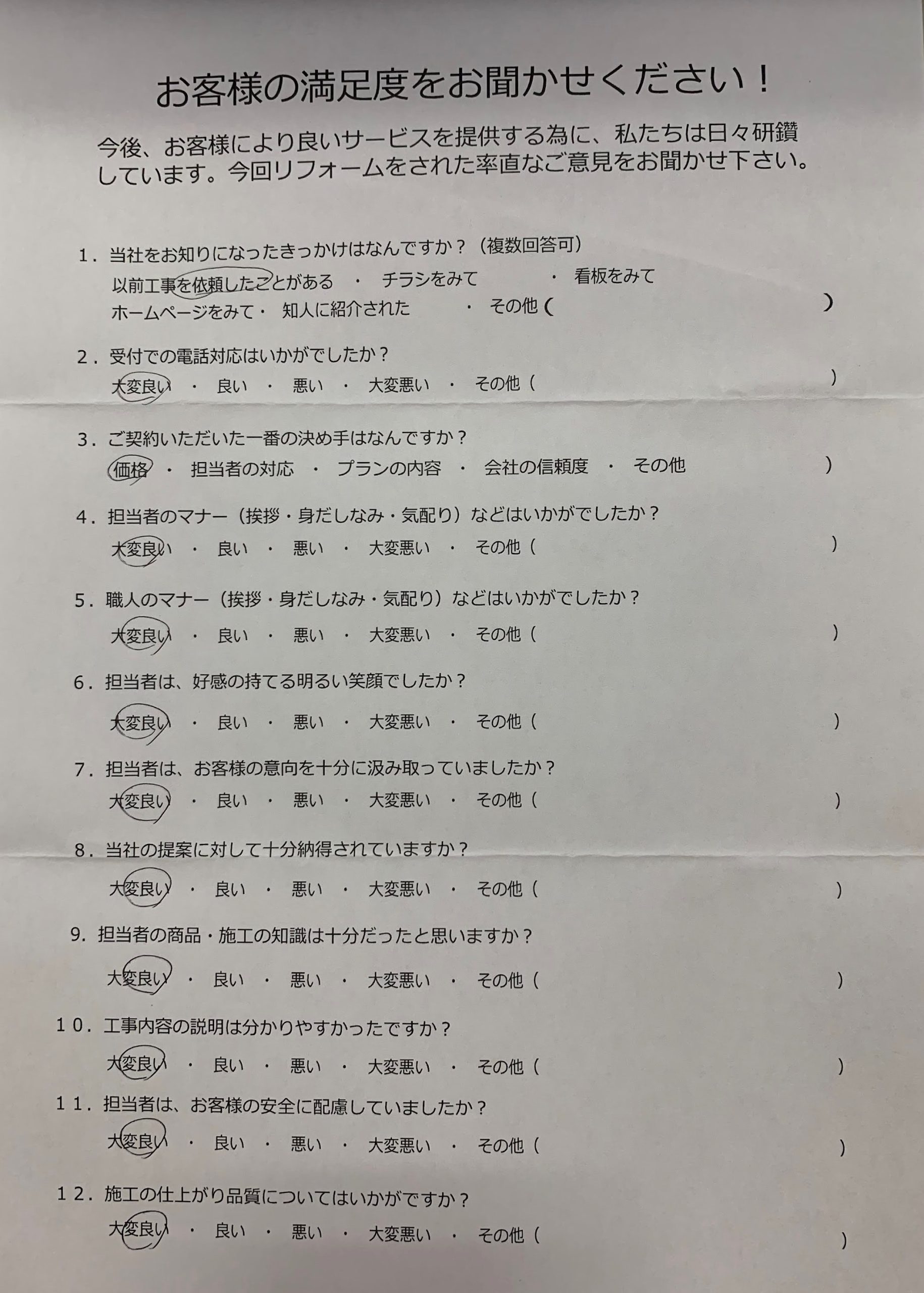 いつも家にいるわけではないので、仕事のない都合のいい日に段取りをつけてもらい、工事の日時までも早目にお願いできたのが良かったです。