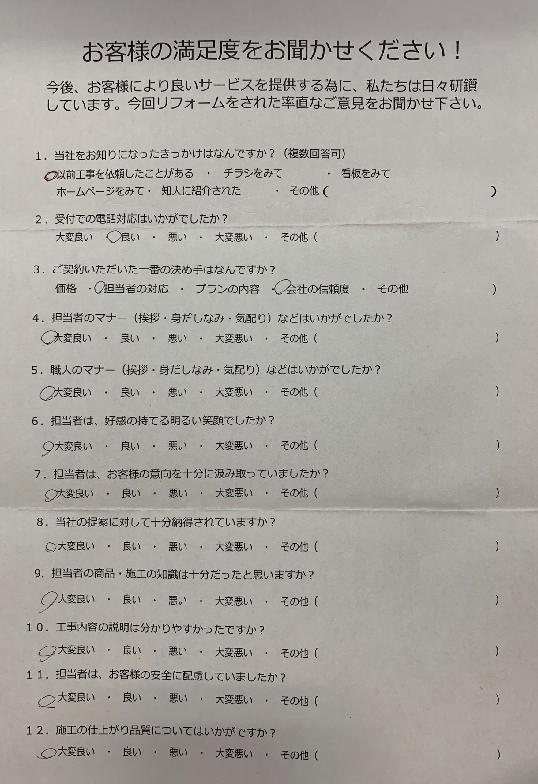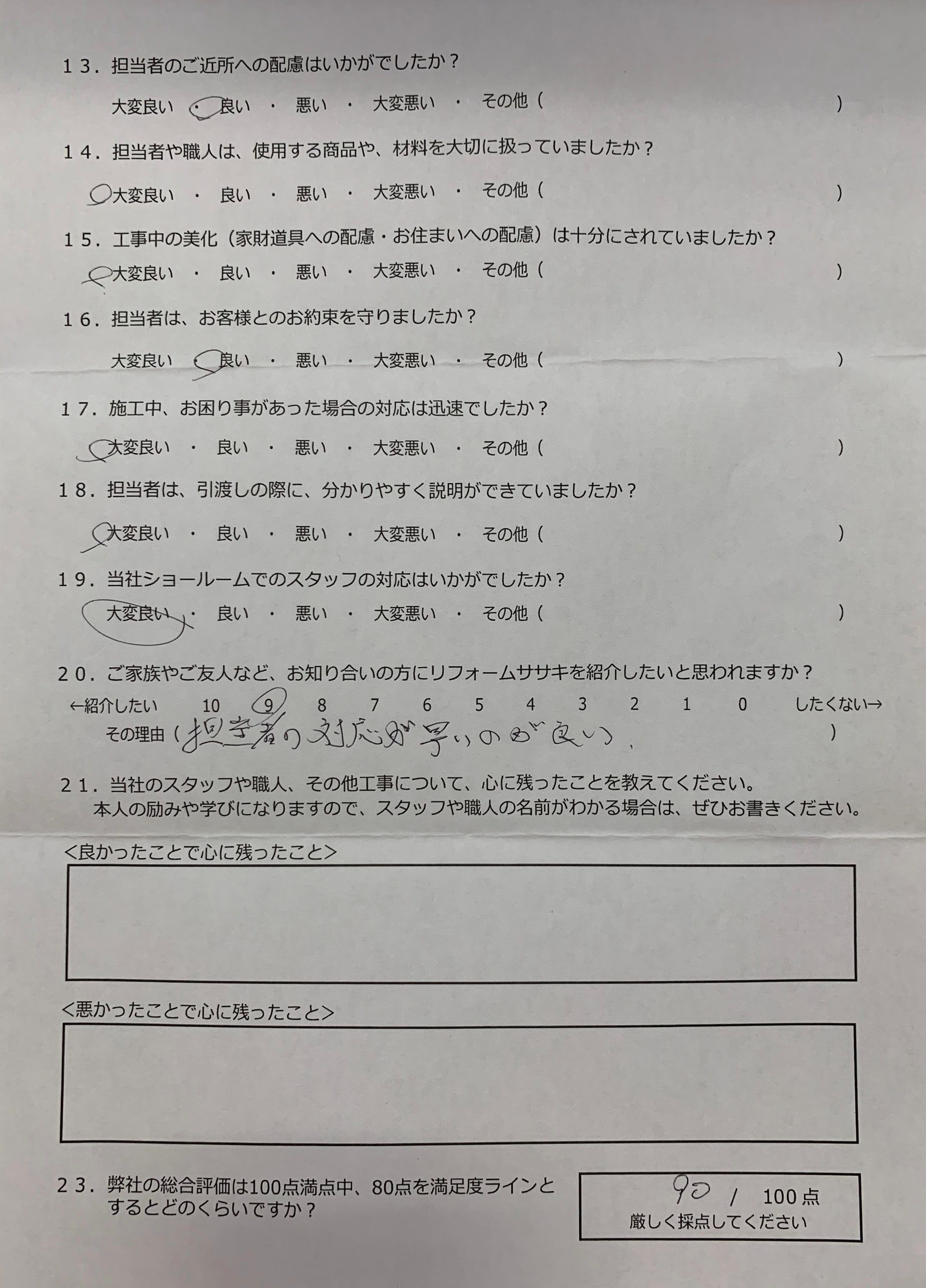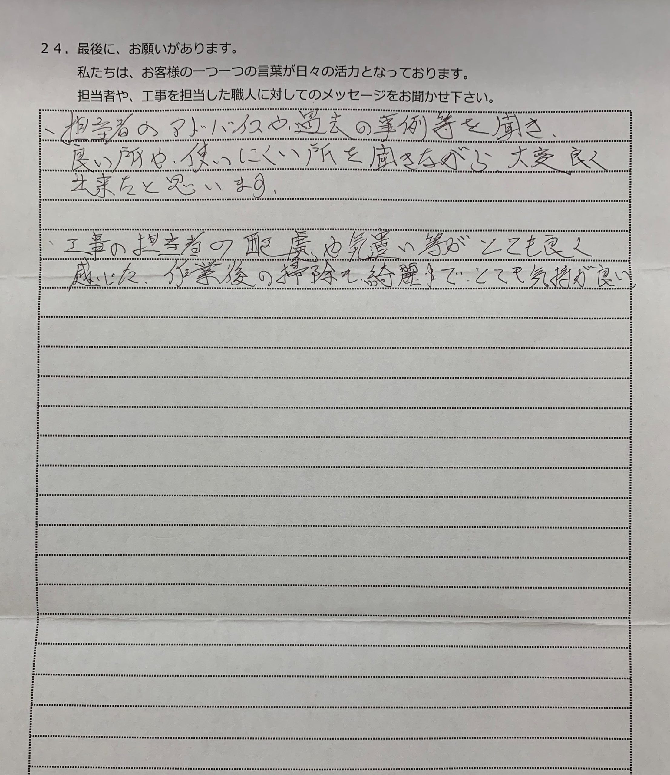 相当者のアドバイスや過去の事例等を聞き、良い所や使いにくい所を聞きながら、大変良く出来たと思います。 工事の担当者の配虞や気遣いがとても良く感じた、作業後の掃除も綺麗でとても気持ちが良い。